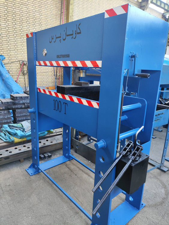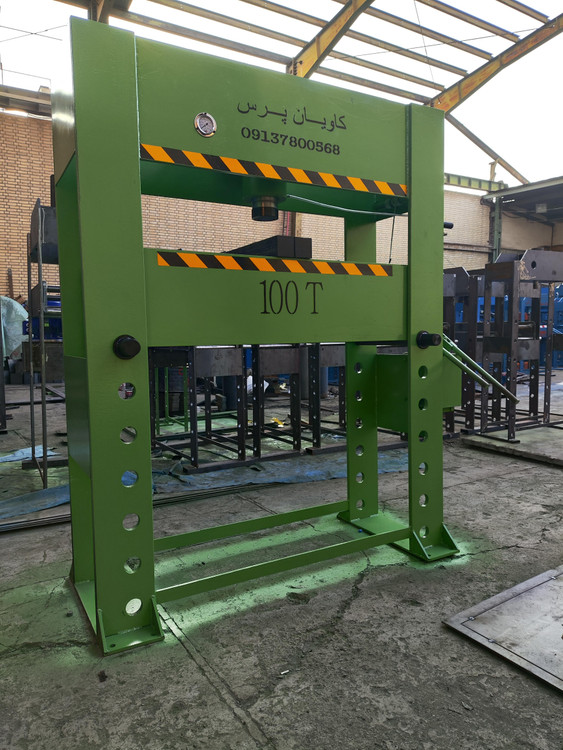 پرس 100 تن حرفه ای برند کاویان پرس ابعاد 160*50*200 دهانه جلو 120 سانتیمتر ستونها و تاج بالا 20 میل میز کار 25 میل 100 تن واقعی با شافت کروم استیل و سسیلندر سنگ خورده H8 پمپ400 بار فشار قوی بالابر دو کاره دستی و بوکس بادی